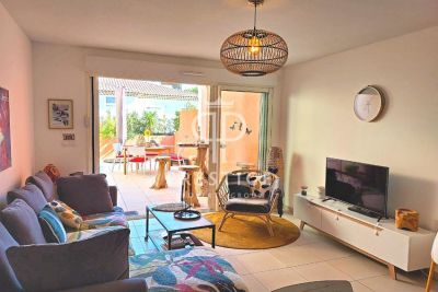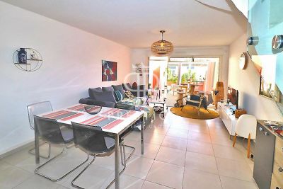 - a living room, with blind and mosquito screen, opening onto a beautiful loggia and a terrace with a total surface area of 28m2, bordered by greenery.