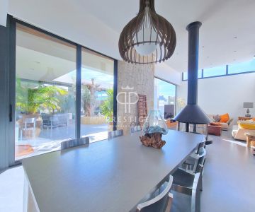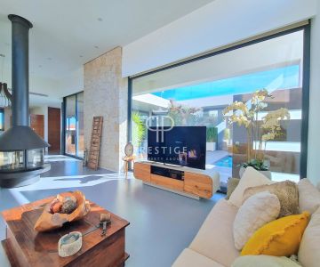 On entering the property, there is a beautiful courtyard, with a swimming pool that also functions as a Jacuzzi. A sitting area is in the courtyard, surrounded by full height windows that allow you to see inside the house, providing a feeling of spaciousness. Once inside the house, you can access the spacious living and dining room that overlooks the courtyard.