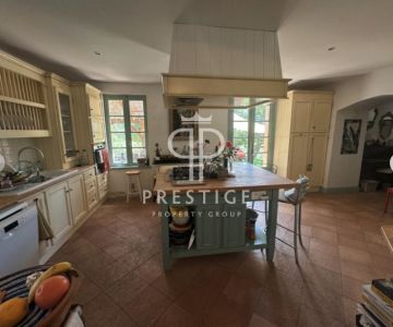 Kitchen (28.9m2) (7.2m x 4. m) with its handmade kitchen units, wooden worktops with lots of drawers, double sink, central island with a gas hob and extractor hood over, radiator and tiled floor. A small pantry is at the side and a Qettle hot water boiler.