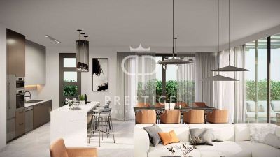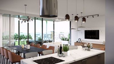 The overall design is modern with simple elegant lines, open plan layout for kitchen, living room and dining room.