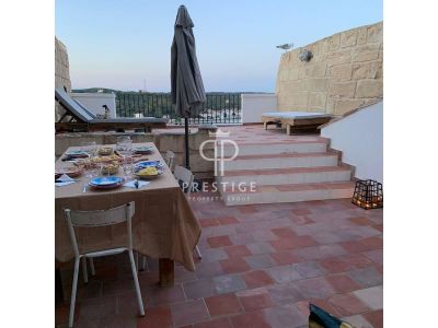 On the ground floor, upon entering, an elegant vestibule leads to a spacious living room and a generous dining room. Also on this level is the kitchen, which provides access to the courtyard, and a potential bedroom with its own bathroom. From the kitchen, one can access the double-height basement, offering windows with sea views. Furthermore, from the living room, there is access to another basement that extends along the property towards the street.