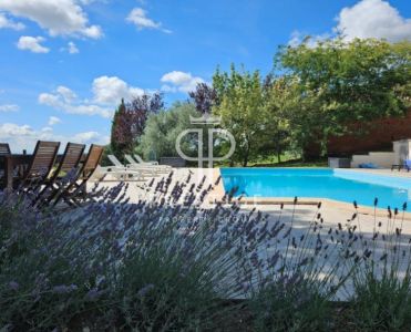 Outside, the huge terrace leads down to a salt swimming pool with its sunbathing terraces and to the land belong which extends to about 1.2 hectares in total. To the side of the house, there is also a huge hangar in two parts which has potential to be developed.